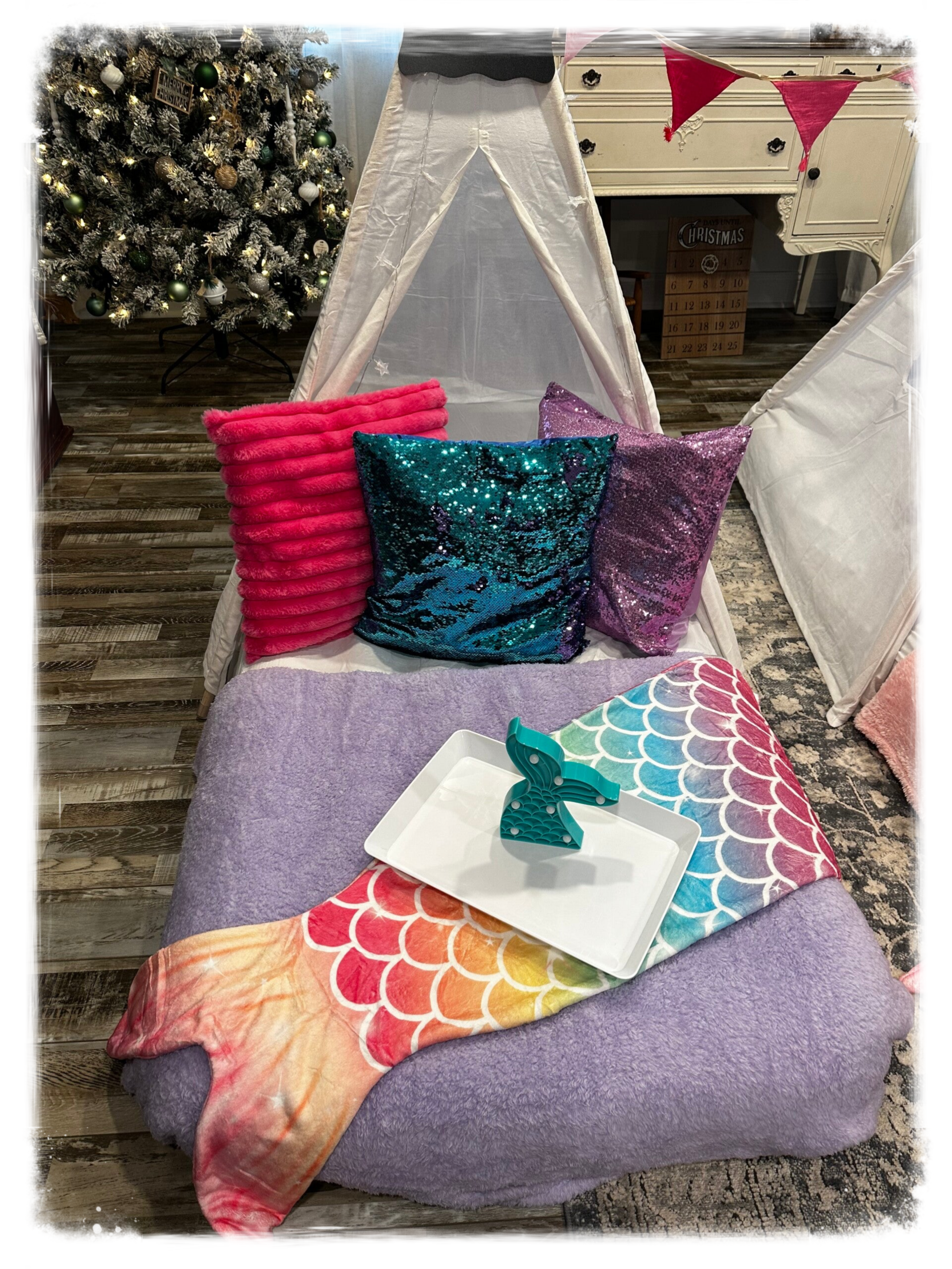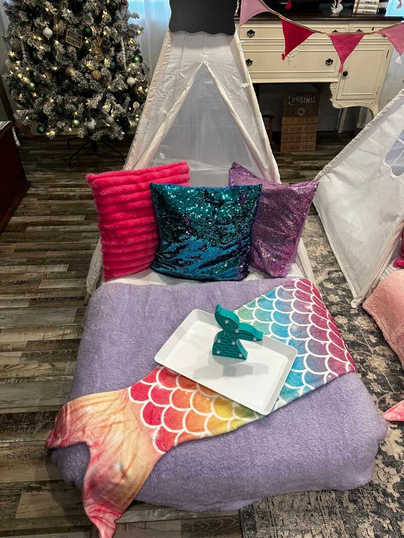 Dive into an oceanic dream with mermaids, twinkling lights, and mermaid tails.